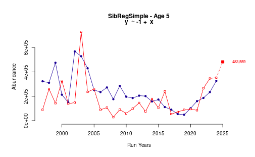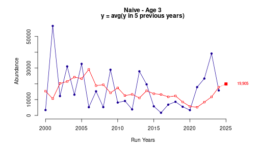 Age 3 sockeye must be predicted using the naive model (forecast based on avg of the 5 previous years) because there is no younger age class to relate it to in a sibling regression.