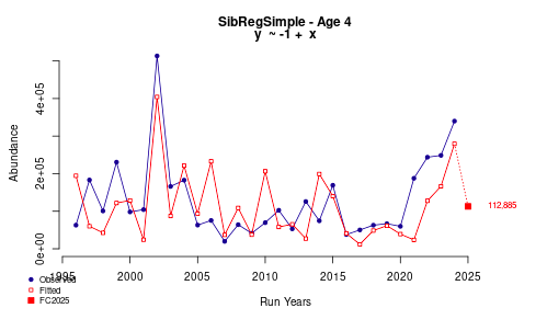 Plot of observed vs fitted return numbers using simple sibling regression prediction model for Age Class 4