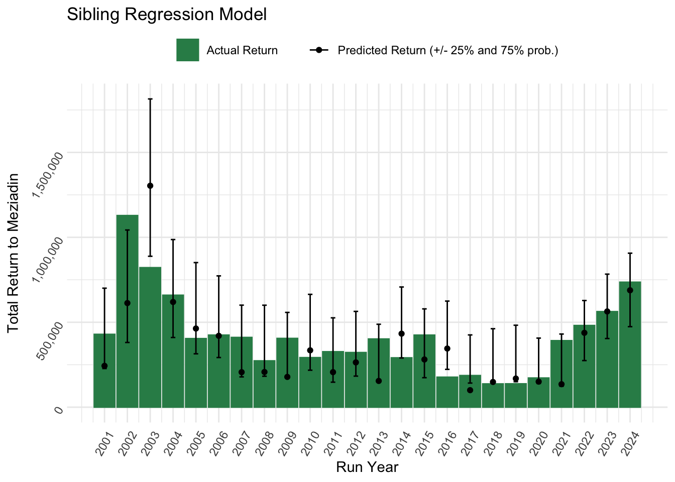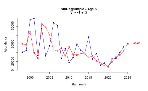 Observed vs fitted return numbers using simple sibling regression prediction model for Age Class 6