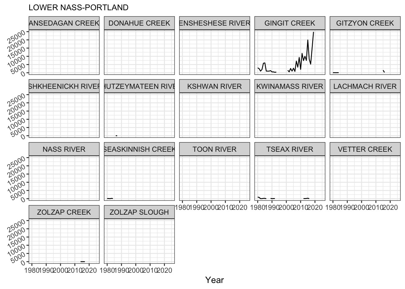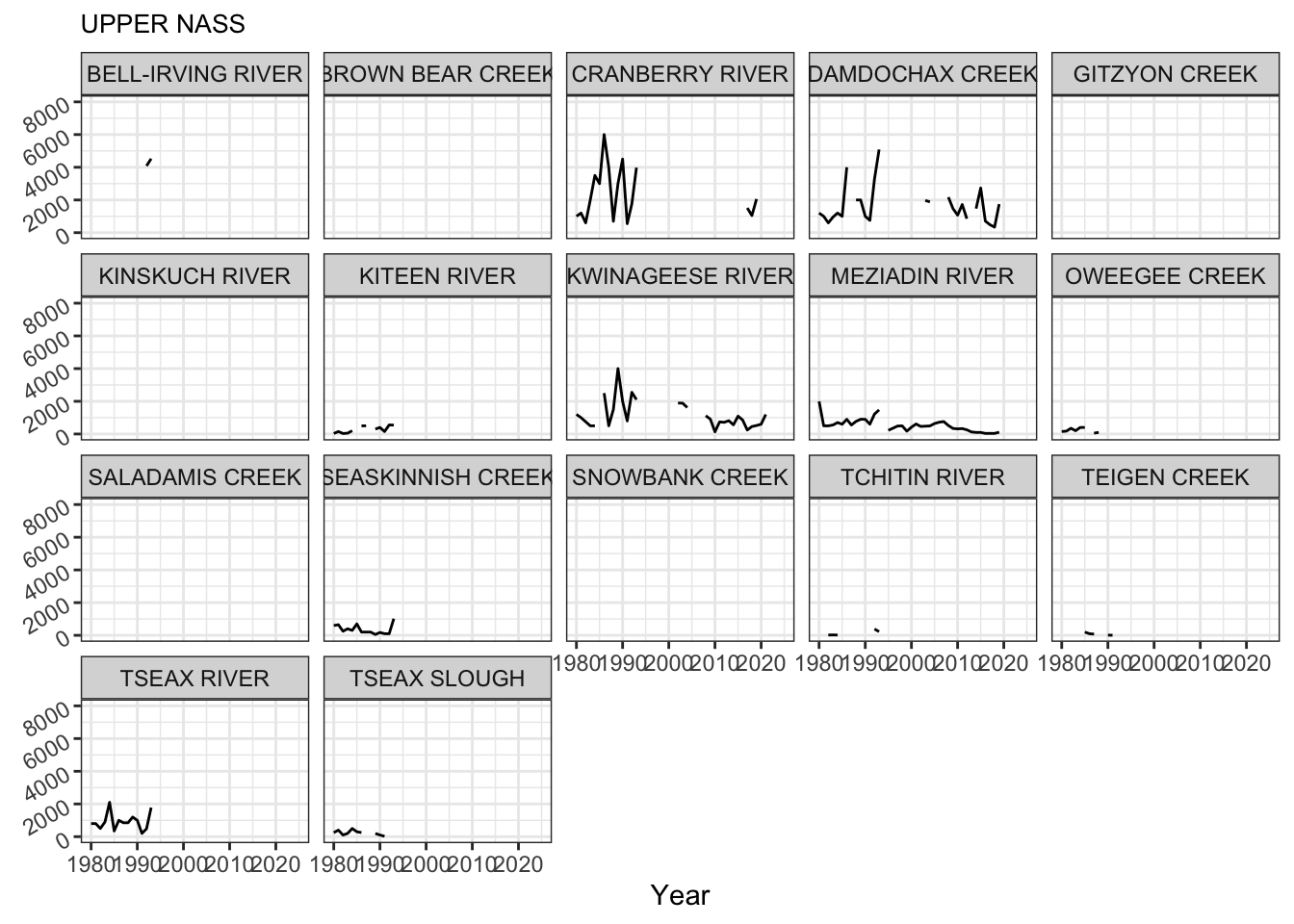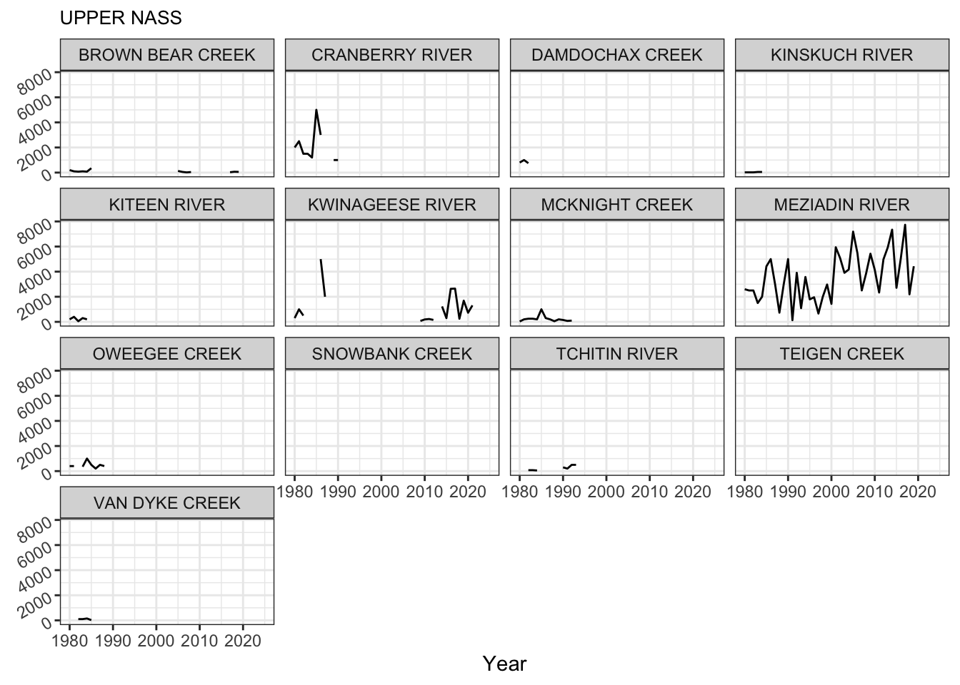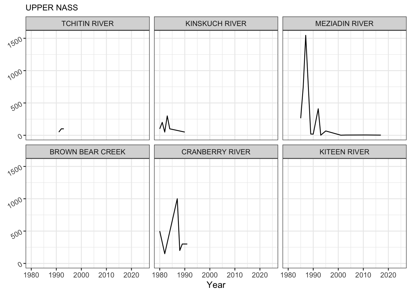 This resource document shows information on salmon escapement and harvest (Canadian and total exploitation) in the Nass watershed. We display escapement for Area 3 (Nass) overall, escapement by Conservation Unit and stream, and exploitation rates for each salmon species. TRTC for steelhead trout in the Nass watershed is also presented. We are also working to forecast sockeye returns for the Meziadin system specifically, and show preliminary results from forecast models here.