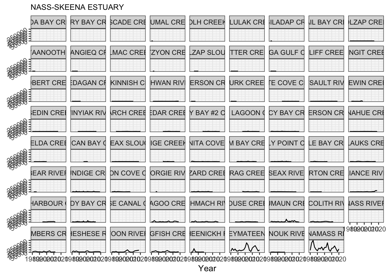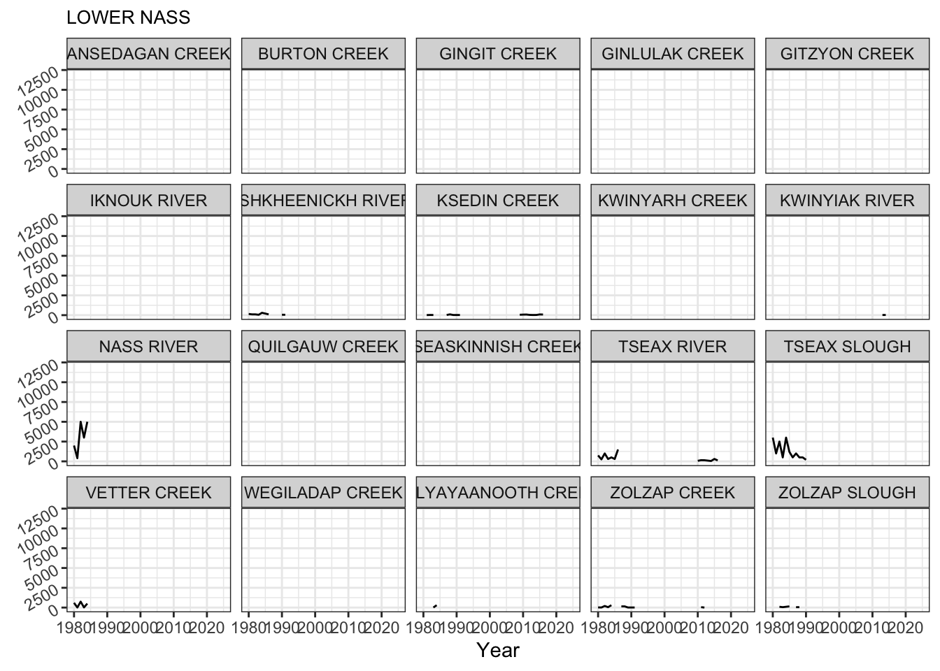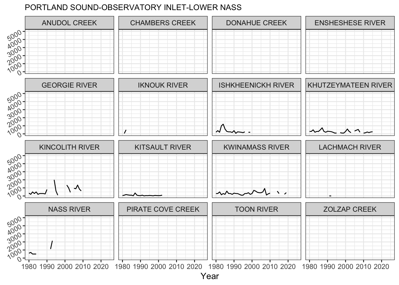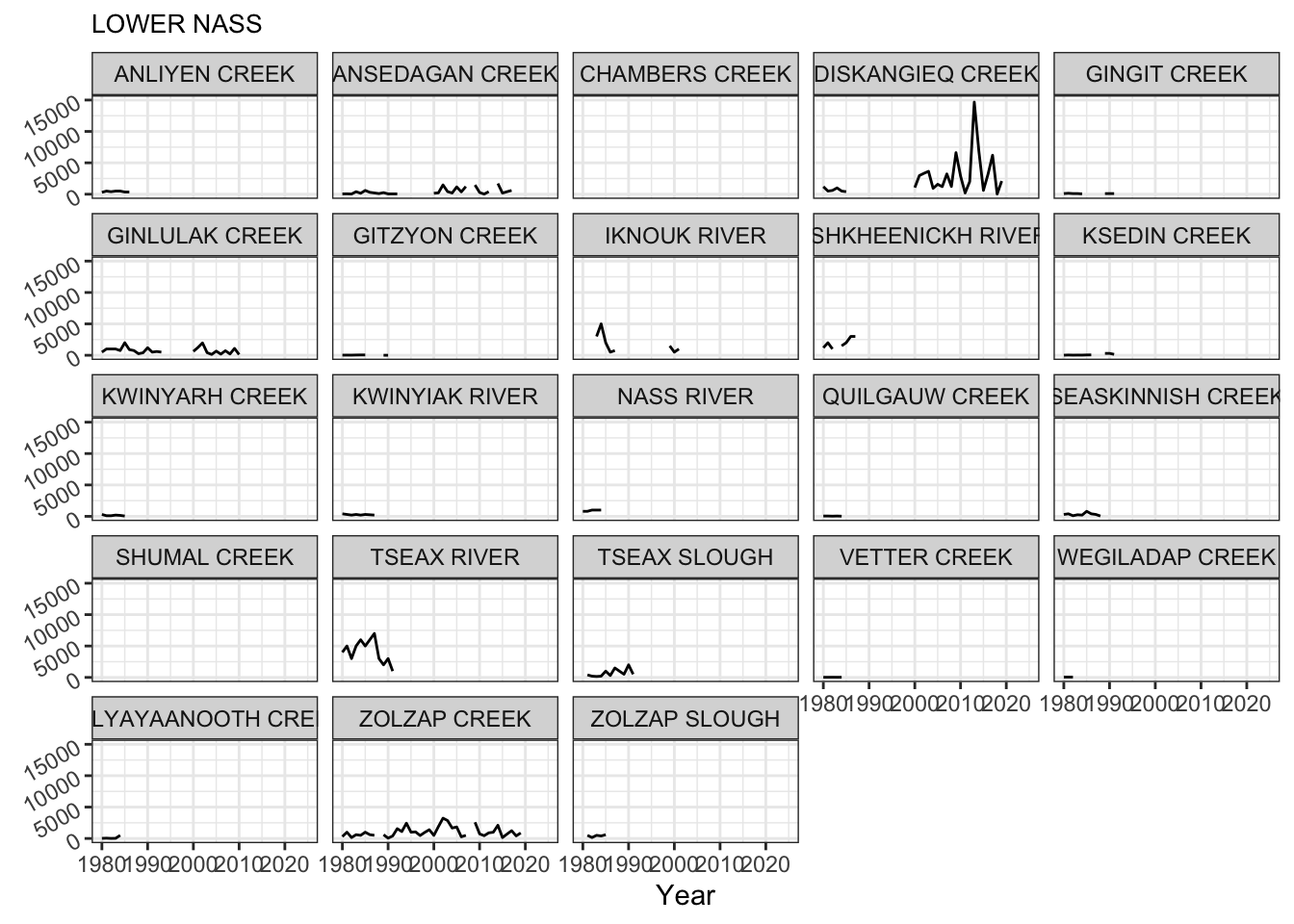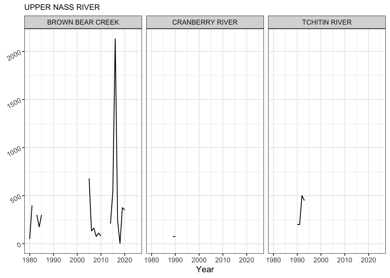 This resource document shows information on salmon escapement and harvest (Canadian and total exploitation) in the Nass watershed. We display escapement for Area 3 (Nass) overall, escapement by Conservation Unit and stream, and exploitation rates for each salmon species. TRTC for steelhead trout in the Nass watershed is also presented. We are also working to forecast sockeye returns for the Meziadin system specifically, and show preliminary results from forecast models here.