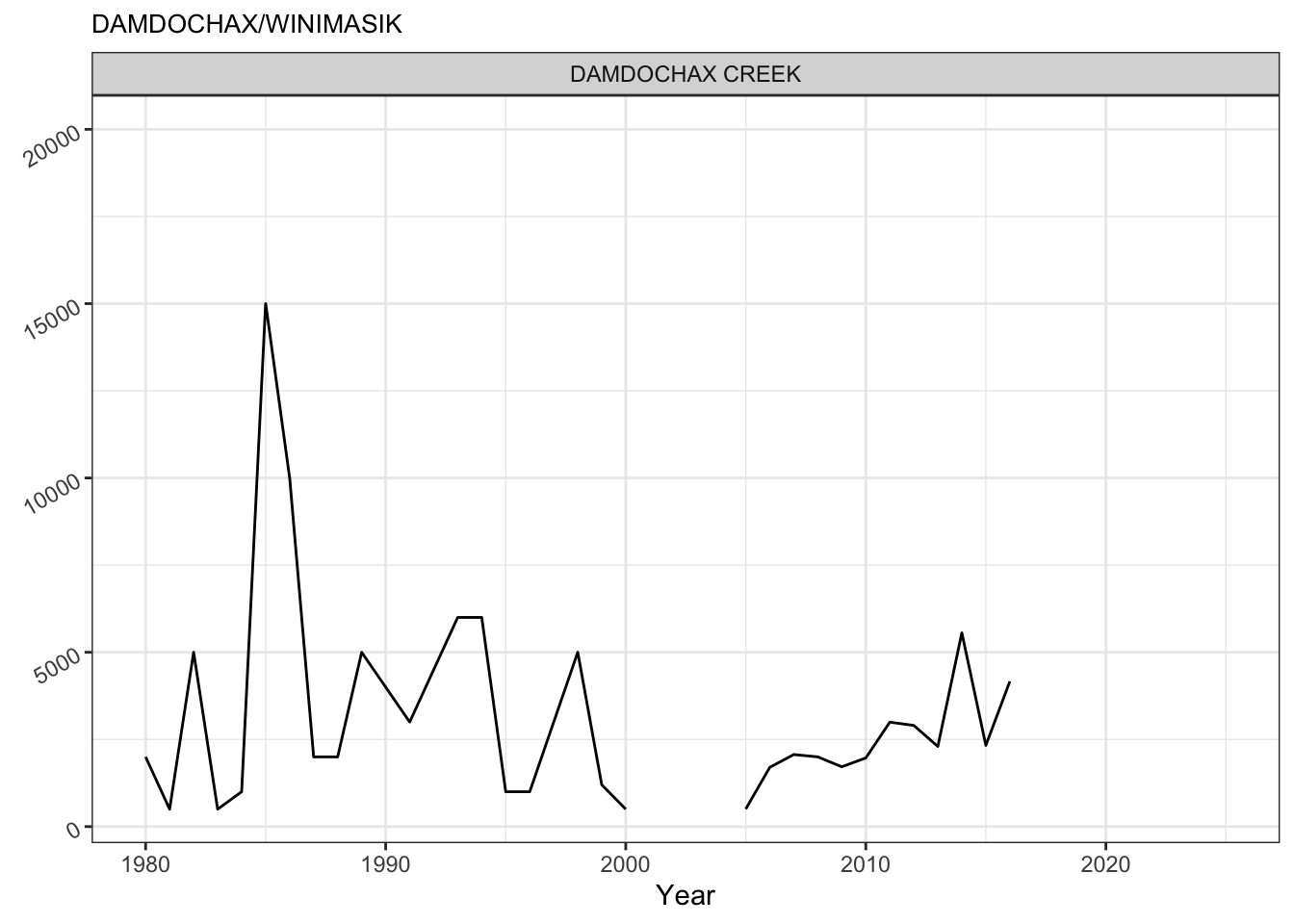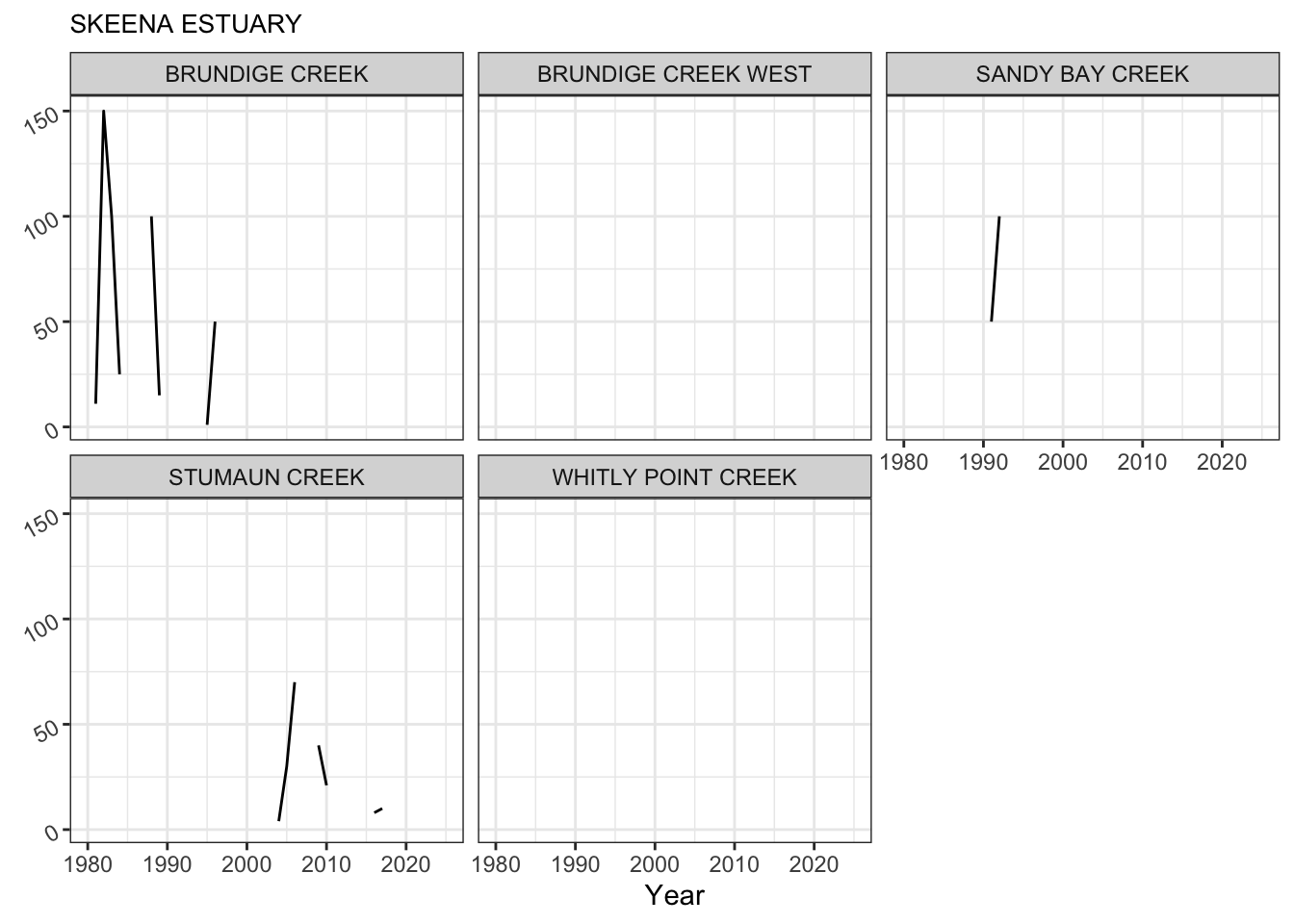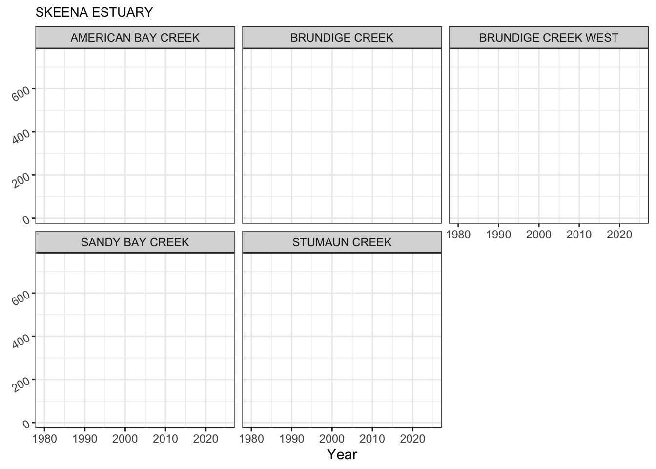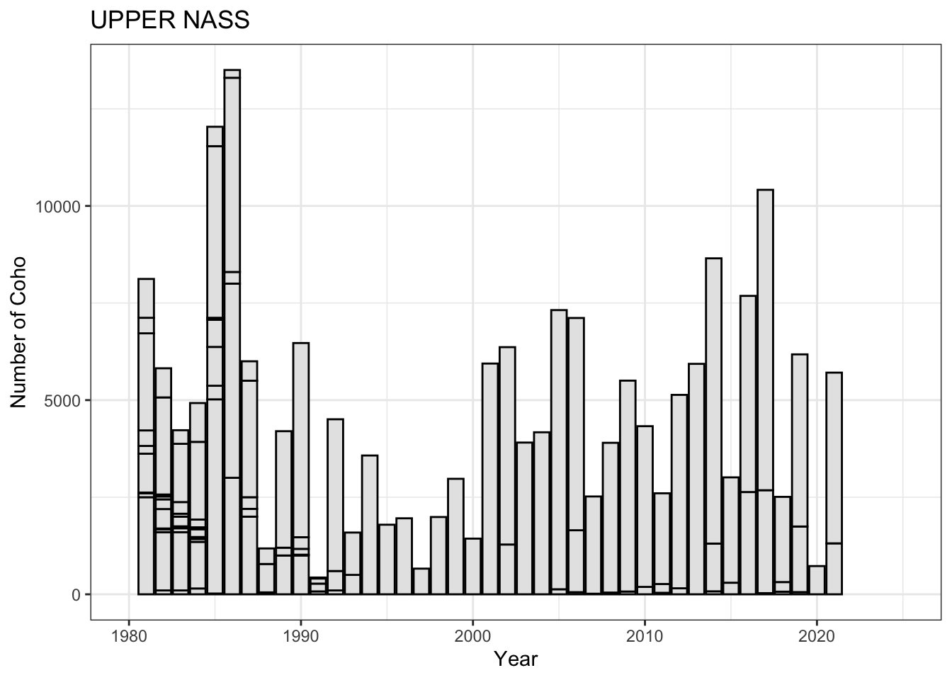 This resource document shows information on salmon escapement and harvest (Canadian and total exploitation) in the Nass watershed. We display escapement for Area 3 (Nass) overall, escapement by Conservation Unit and stream, and exploitation rates for each salmon species. TRTC for steelhead trout in the Nass watershed is also presented. We are also working to forecast sockeye returns for the Meziadin system specifically, and show preliminary results from forecast models here.