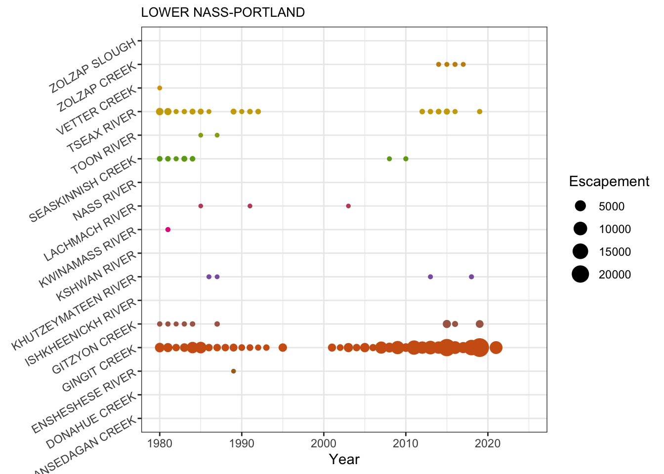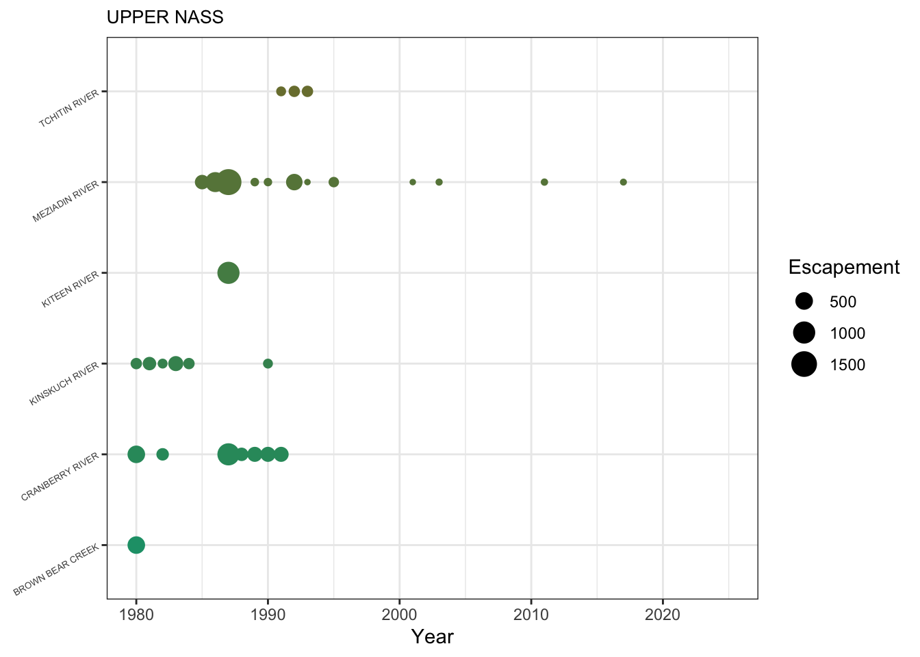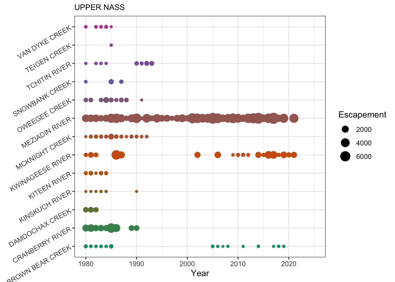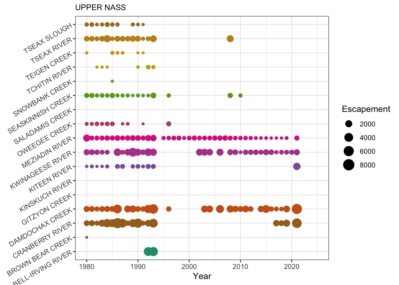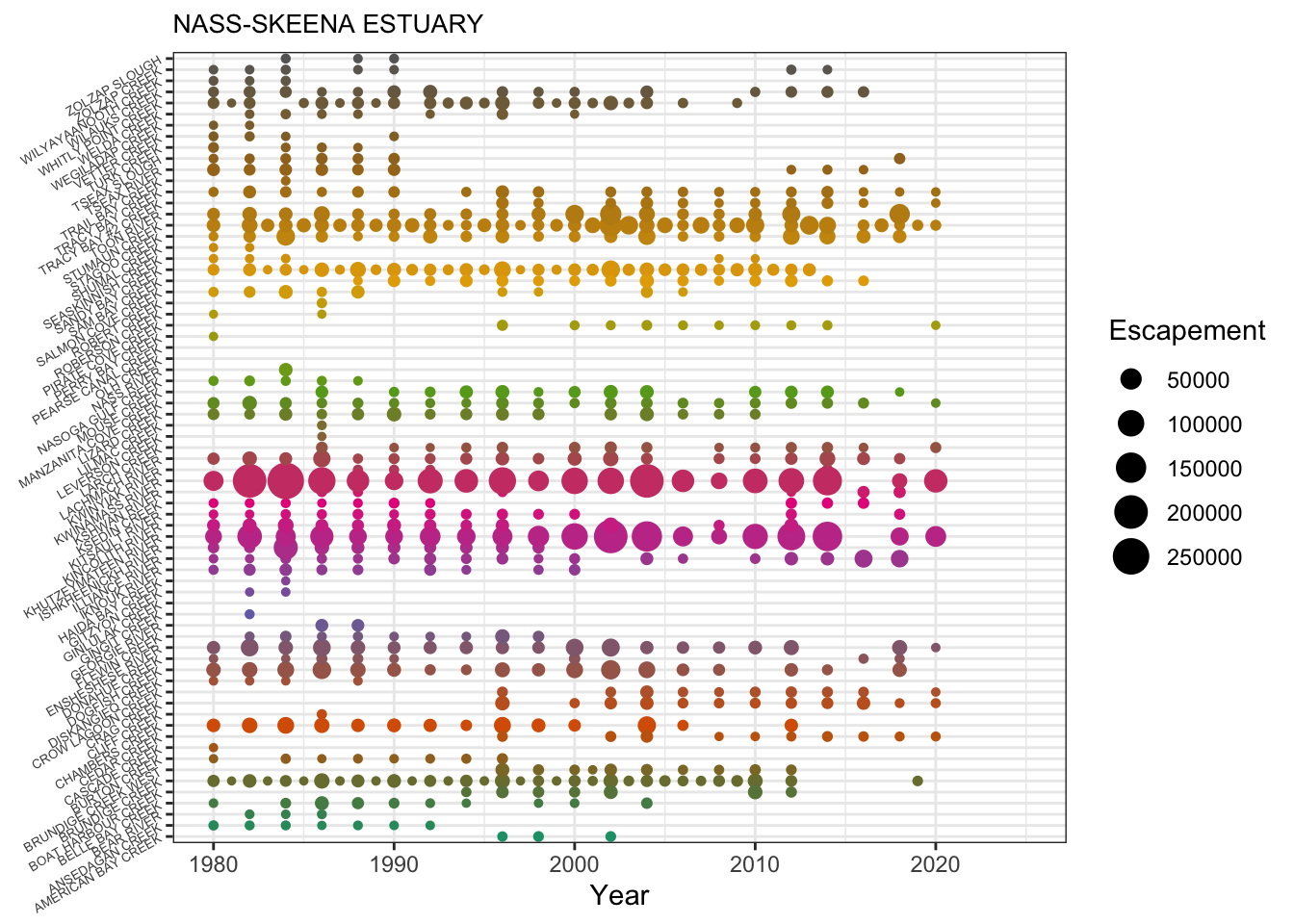 Data on each salmon species’ escapement by Conservation Unit comes from the NUSEDS database.