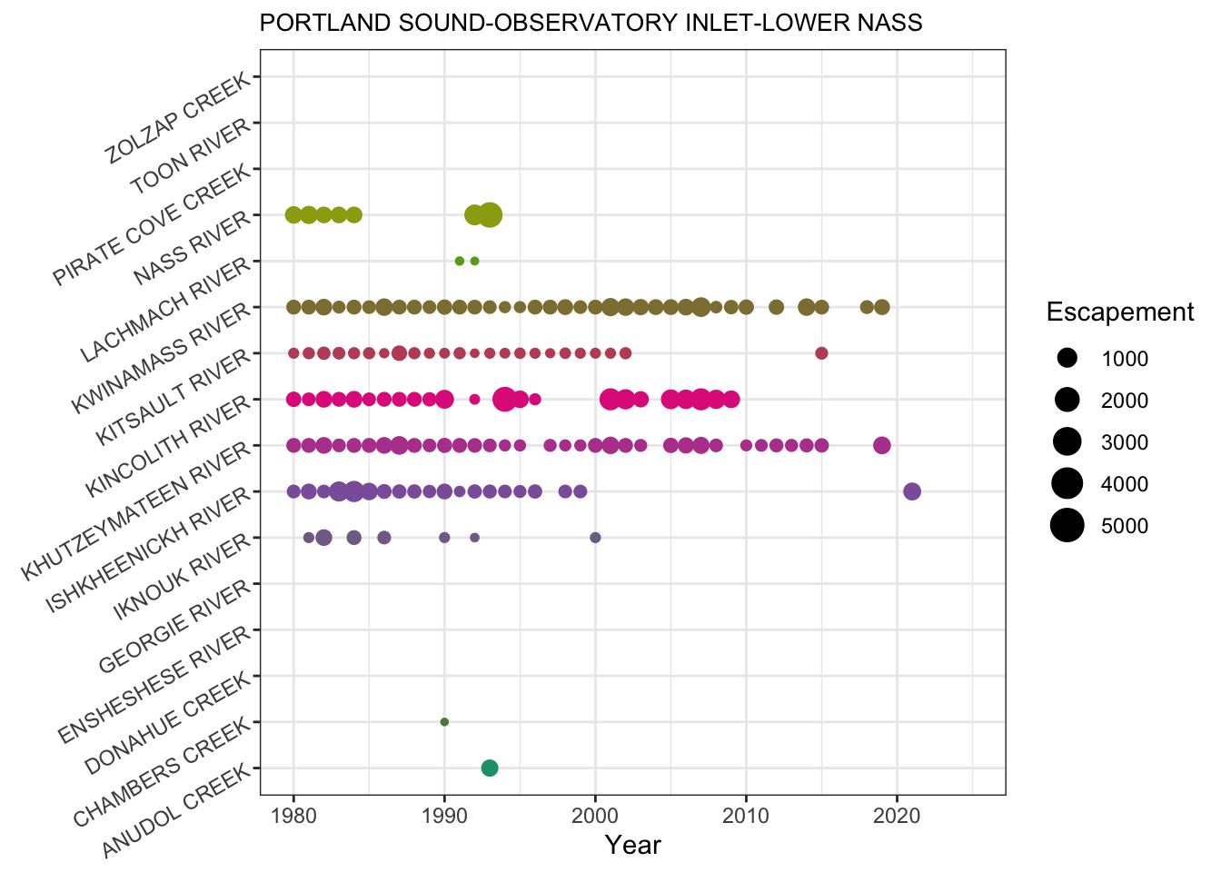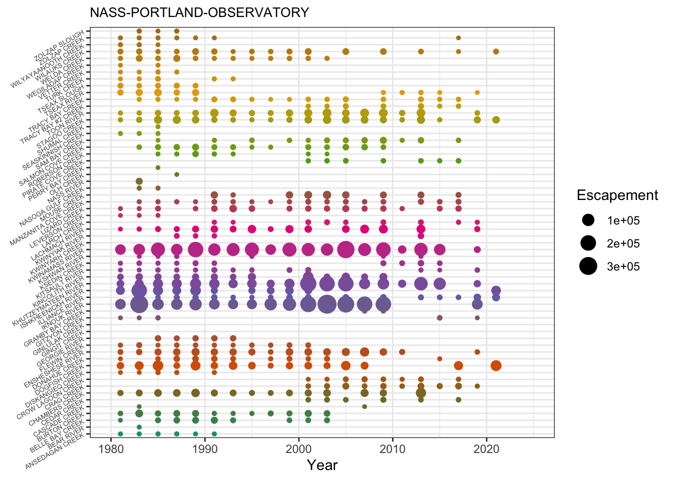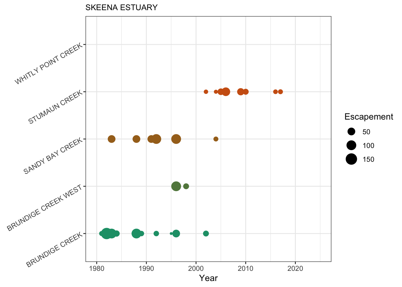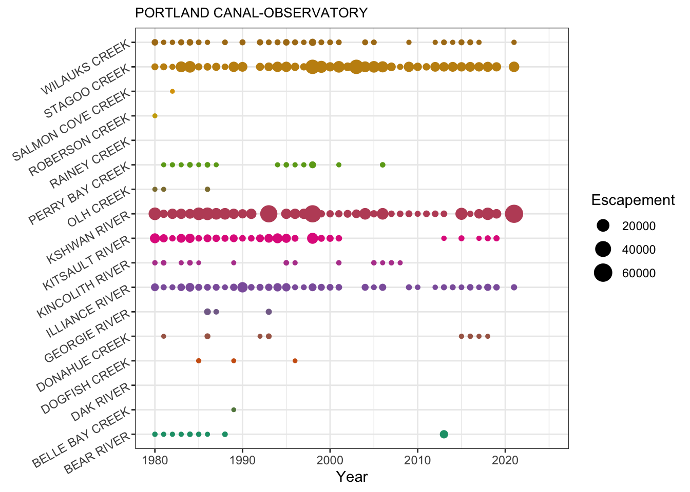 Data on each salmon species’ escapement by Conservation Unit comes from the NUSEDS database.