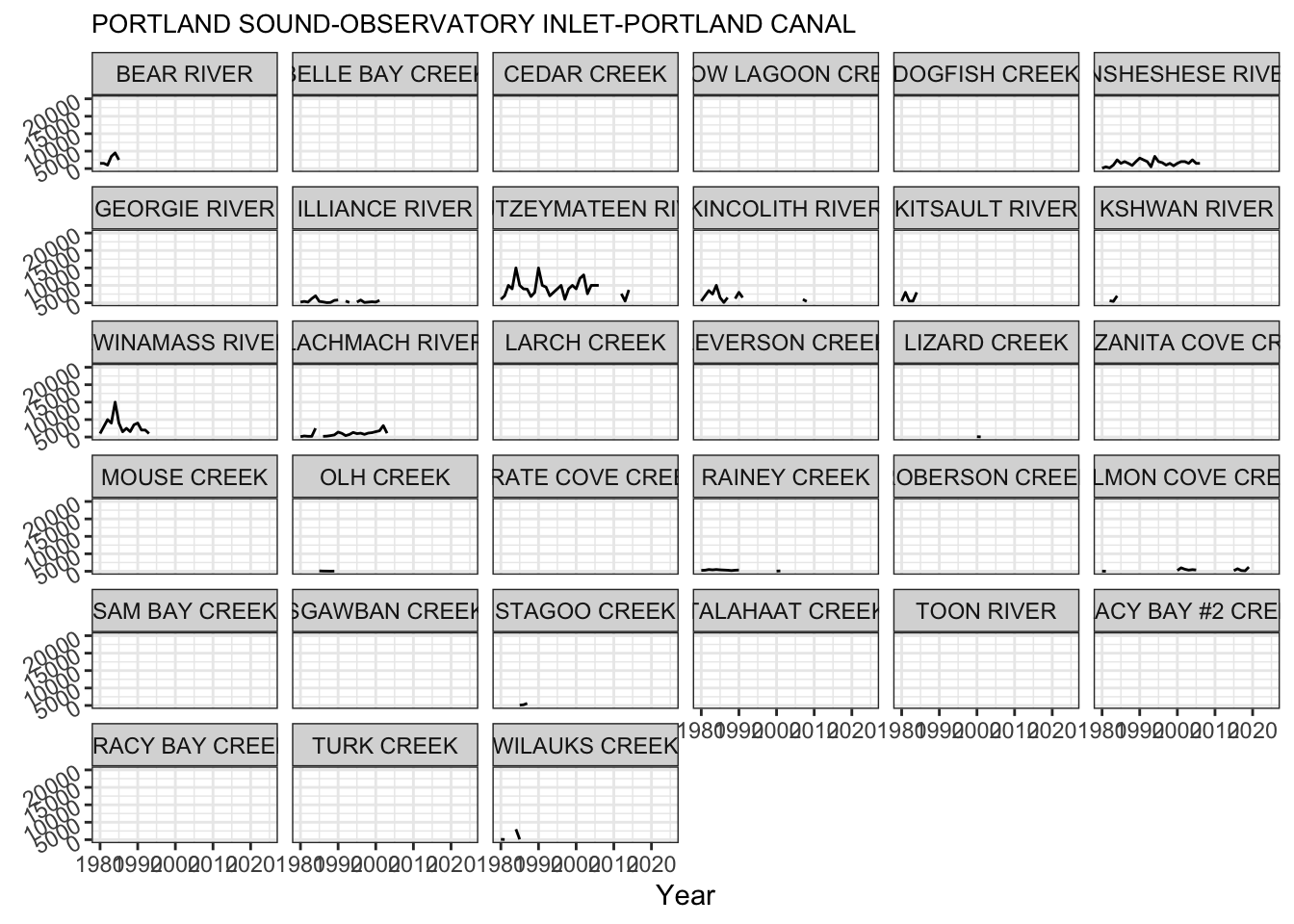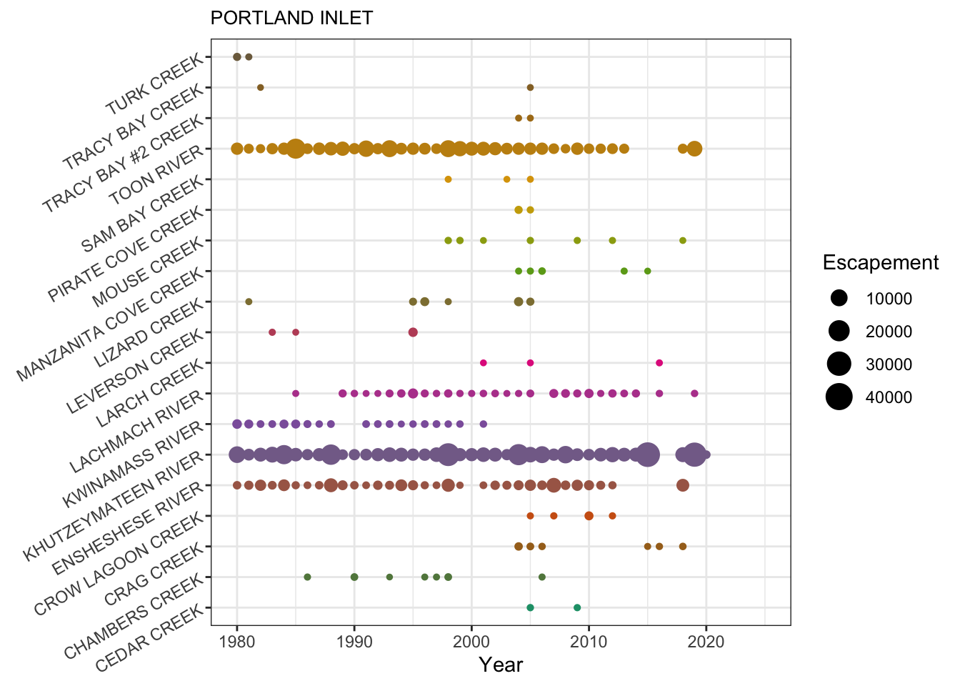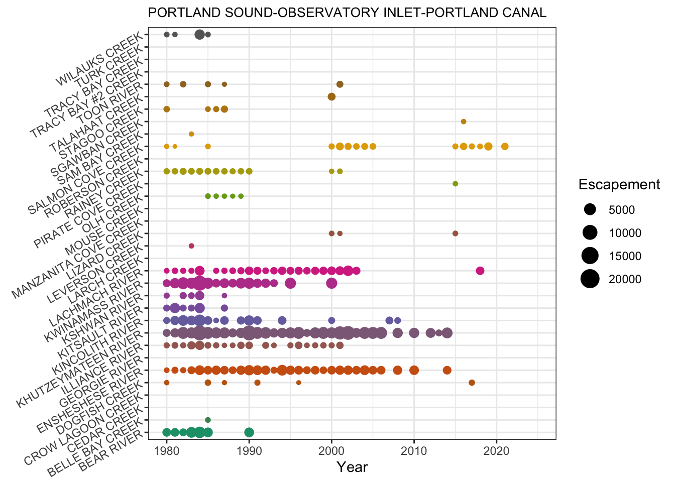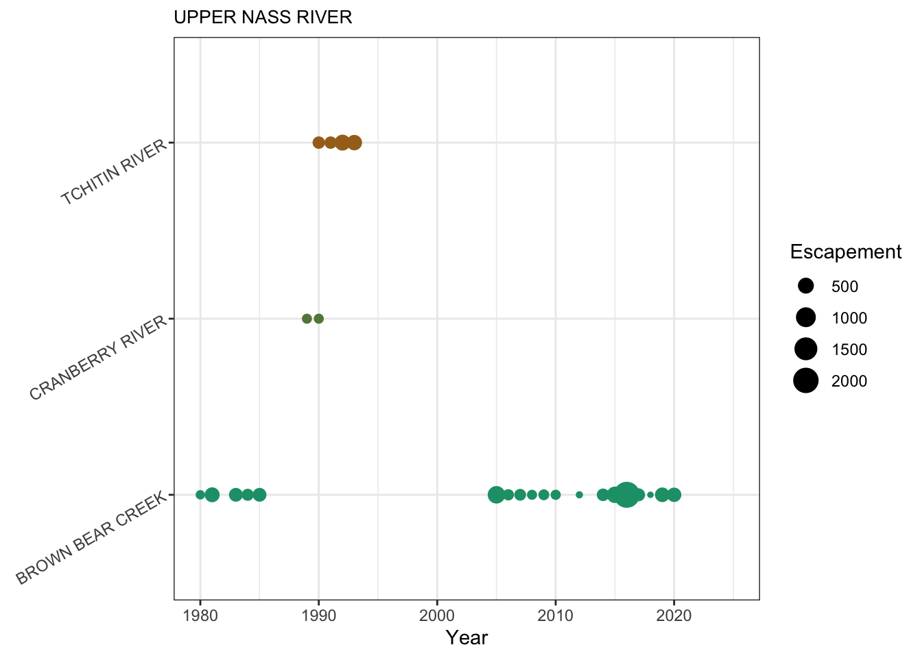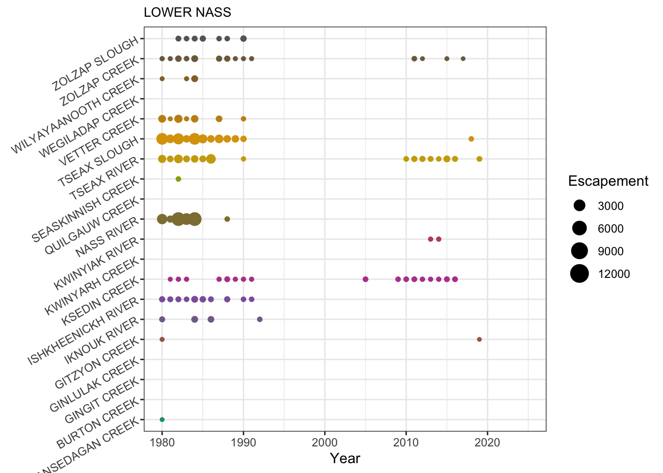 Data on each salmon species’ escapement by Conservation Unit comes from the NUSEDS database.