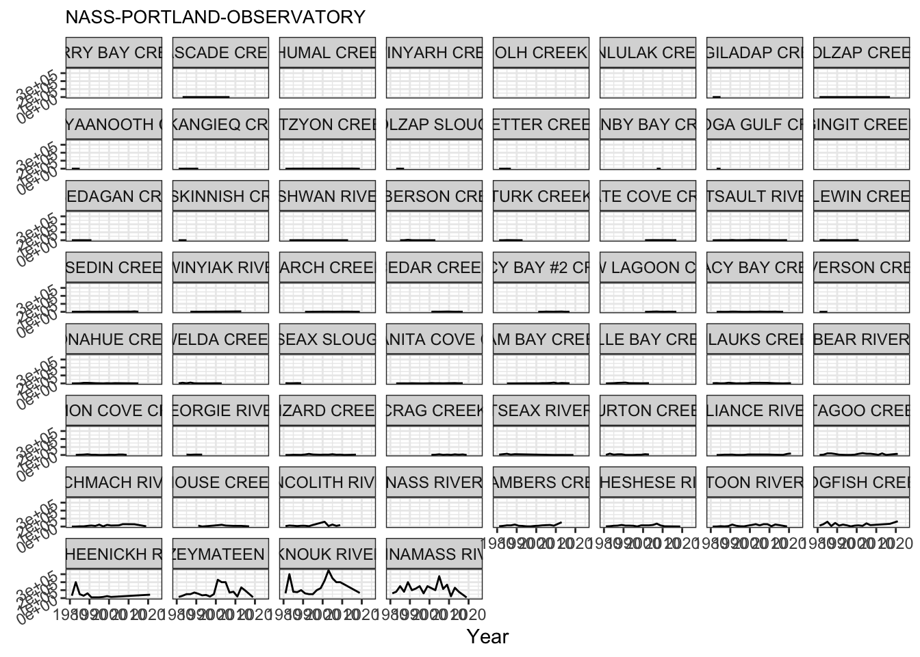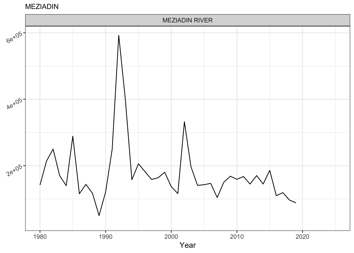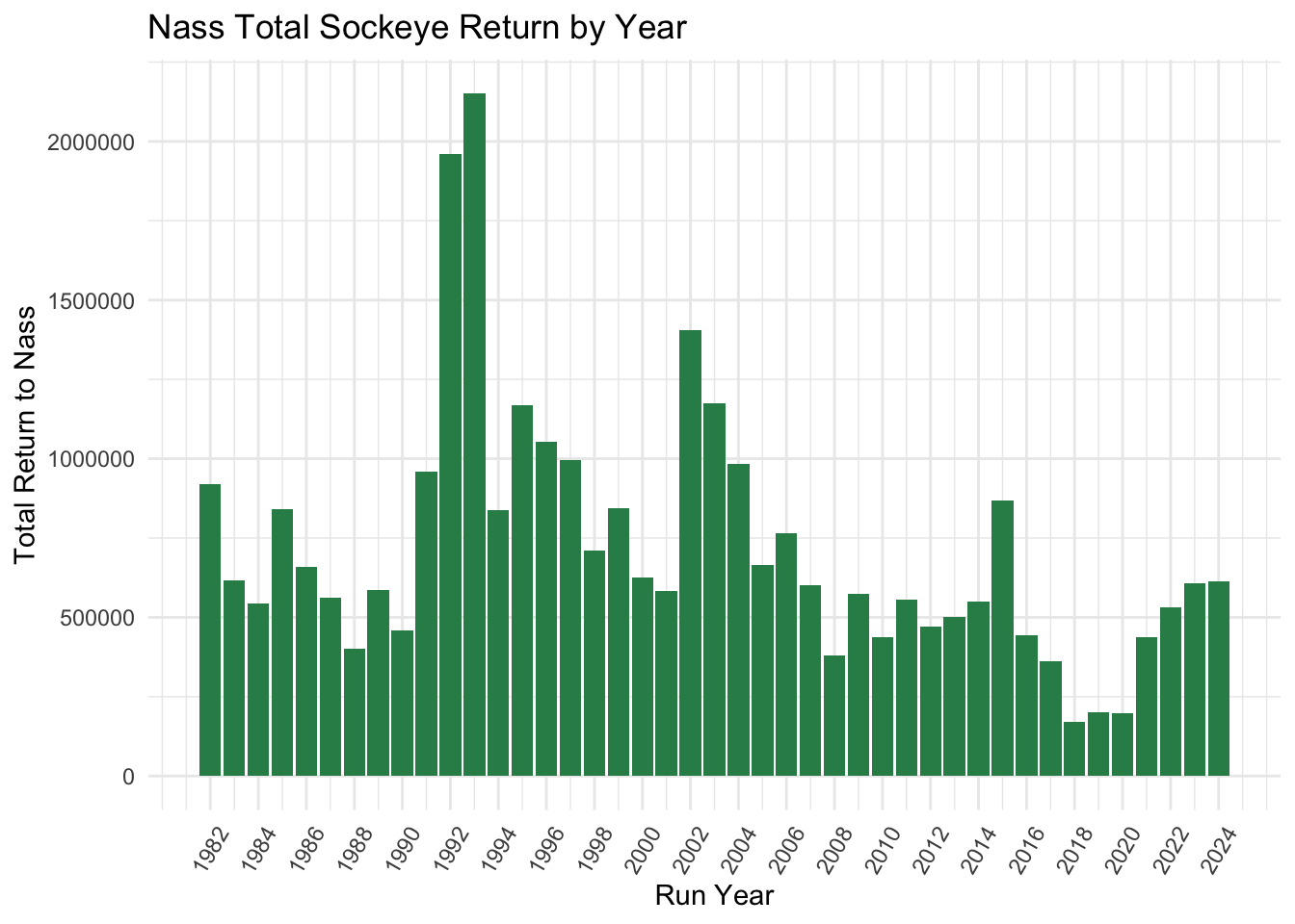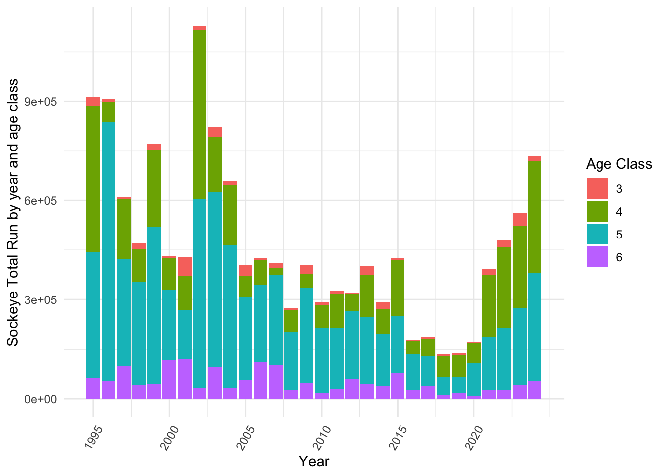 We are using ForecastR, an R package and Shiny app, to predict total returns of sockeye salmon from the Meziadin system based on previous years’ data on Meziadin total return and escapement. The Meziadin total return data is a subset of the Nass total return, including escapement plus the salmon harvested in fisheries which do not make it back to spawning grounds. The sockeye total run numbers for each year are categorized by age, with sockeye separated into age classes 3, 4, 5, and 6.