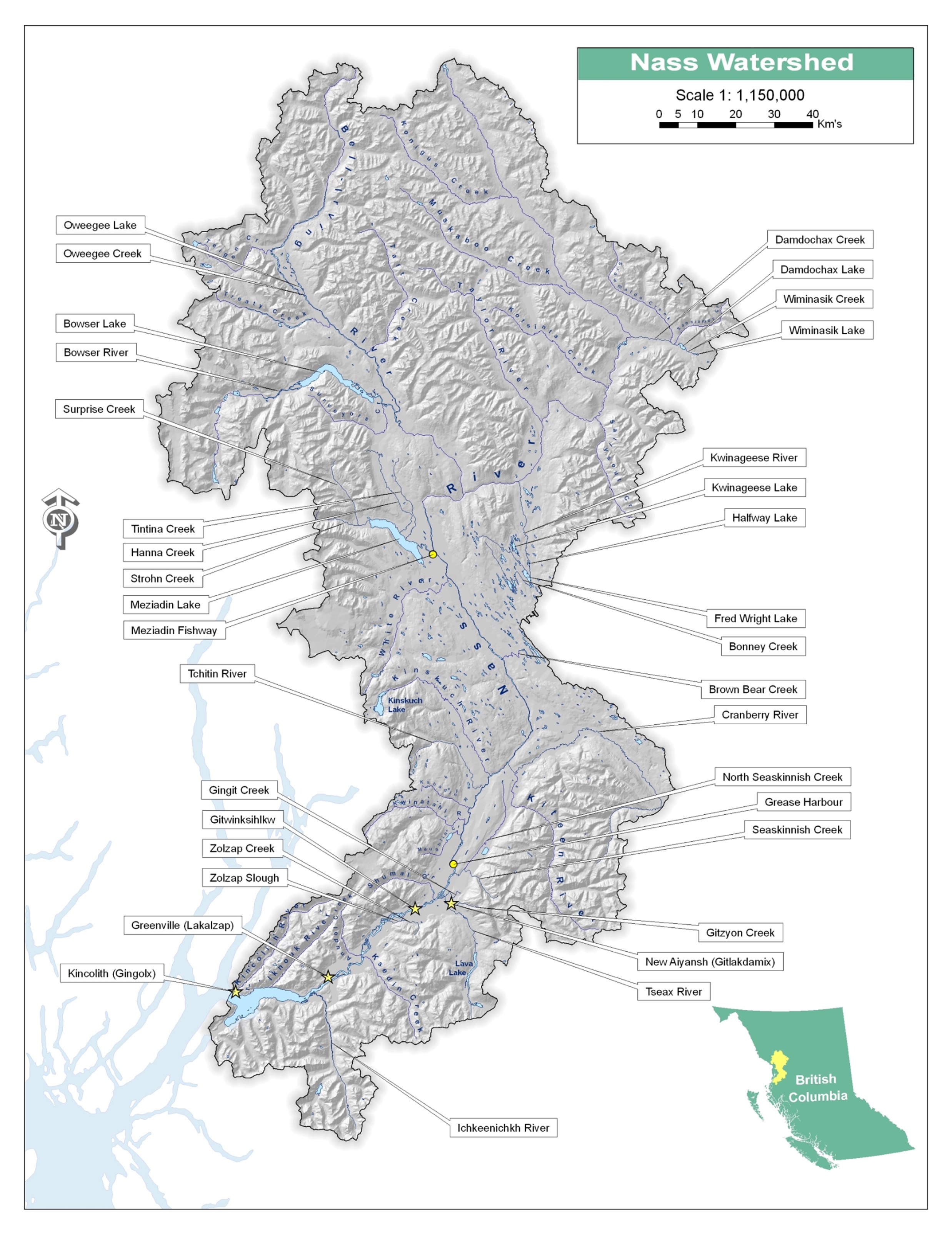 Map showing the Nass watershed extent (figure taken from Peter Hall’s CSAS paper on Skeena / Nass )